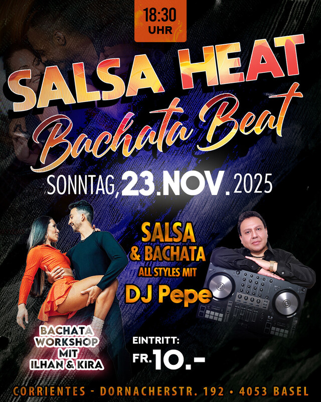 🔥 SALSA HEAT – BACHATA BEAT 📅 Sonntag, 23. November 2025 🕣 Ab 18:30 Uhr 📍 Corrientes, Dornacherstrasse 192, Basel 🎟️ Eintritt: CHF 10.- 💃 Eine Tanzflaeche – zwei heisse Styles! Du liebst Salsa und Bachata? Dann ist diese Party genau dein Ding! Hier treffen sich Salseros & Bachateras auf einer gemeinsamen Tanzfläche – für eine Nacht voller Rhythmus, Spass & Verbindung. 🎧 DJ PEPE sorgt für die perfekte Mischung: Salsa Puertorriqueña, ON2, Old School & Romántica trifft auf Bachata Sensual, Moderna, Fusion & zeitlose Klassiker. 🕺 18:30 Uhr – Bachata-Workshop mit Ilhan & Kira Perfekt zum Aufwärmen und Kennenlernen! ✨ Freu dich auf eine familiäre Stimmung, tolle Musik und viele neue Tanzkontakte! Die Jubiläumsfeier von DJ Pepe geht weiter! Vor der Party ist nach der Party. #SalsaHeatBachataBeat #DJPepe #CorrientesBasel #SalsaBasel #BachataBasel #LatinNight #SalsaUndBachata #BaselTanzt #TanzpartyBasel