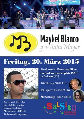 Freitag, 20. März 2015 Livekonzert MAYKEL BLANCO Y SU SALSA MAJOR, Party und Show im Saal am Lindenplatz (SAL) in Schaan (FL) Türöffnung 20 Uhr DJ Cigarro bis 2 Uhr Showeinlage Yura Cantillo Vorverkauf CHF 35.- bis 18.03.2015 unter kontakt@salsita.li Abendkasse CHF 40.- Ticketanzahl begrenzt!