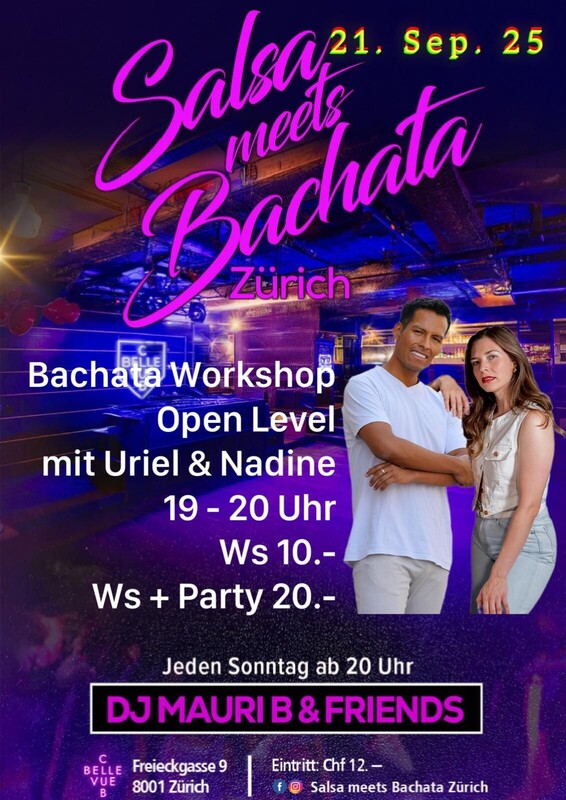 Salsa meets Bachata - Zürich Es wird heiss wenn diese zwei Rhythmen aufeinander treffen. Ein Abend vollgepackt mit dem besten, angesagtesten Sound dieser zwei Stile - da kann niemand mehr ruhig sitzen. Ganz nach dem Motto: BEST MUSIC, ONLY KILLER, NO FILLER ! Salsa und Bachata - all styles Ws 10.- / Ws + Party 20.- Start Bachata Workshop: 19 Uhr mit Uriel & Nadine Start Party: 20 Uhr Dj Mauri B fb & insta: Salsa meets Bachata Zürich Zahlungsmittel: Bar / Kreditkarten / Twint