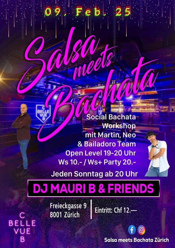 Salsa meets Bachata - Zürich Es wird heiss wenn diese zwei Rhythmen aufeinander treffen. Ein Abend vollgepackt mit dem besten, angesagtesten Sound dieser zwei Stile - da kann niemand mehr ruhig sitzen. Ganz nach dem Motto: BEST MUSIC, ONLY KILLER, NO FILLER ! Salsa und Bachata - all styles Start Workshop: 19 Uhr Social Bachata mit Martin, Neo & Bailadoro Team / 19-20 Uhr / Ws 10.- / Ws +Party 20.- Start Party: 20 Uhr Dj Mauri fb & insta: Salsa meets Bachata Zürich