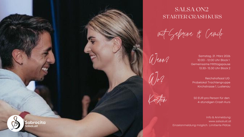 Lust auf Salsa? Dann ist unser Anfänger-Crashkurs genau das Richtige für euch! Egal, ob ihr absolute Anfänger seid oder bereits Salsa LA Style oder Cubana tanzt – dieser Kurs ist der perfekte Einstieg in Salsa On2 (New York Style). In nur 4 Stunden lernt ihr die Basics, um euch selbstbewusst auf die Tanzfläche zu wagen. Was erwartet euch? Die wichtigsten Grundschritte und Techniken für Salsa On2 – solo und im Paar. Ein Verständnis für den Salsa-Rhythmus und die wichtigsten Instrumente. Erste Partnerfiguren, die euch fit für eure erste Salsa-Party machen. Kein Tanzpartner? Kein Problem! Meldet euch einzeln oder im Paar an. Schnappt euch eine/n Freund/in – bei uns dürfen auch Frauen führen! Wir achten darauf, ein ausgewogenes Verhältnis zwischen Leadern und Followern zu schaffen (bei rechtzeitiger Anmeldung). Kurs-Highlights: Individuelle Betreuung: Die Teilnehmerzahl ist begrenzt, damit wir euch gezielt unterstützen und mit Tipps versorgen können. Gemeinsame Mittagspause: Nach dem 1. Block genießen wir die Mittagspause im der Pizzeria Azzura, bevor es in die zweite Runde geht. Details auf einen Blick: Kursdauer: 4 Stunden Kosten: 50 € pro Person (exkl. Mittagessen) Ort: Probelokal der Trachtengruppe Lustenau, Reichshofsaal Lustenau UG, Kirchstraße 1, Lustenau Anmeldung: Die Plätze sind begrenzt, daher bitten wir um eine frühzeitige Anmeldung. Wir freuen uns auf euch! Euer Sabrocita SalsaLust Team Let’s Mambo! https://www.eversports.at/e/workshop/tJS5yKS