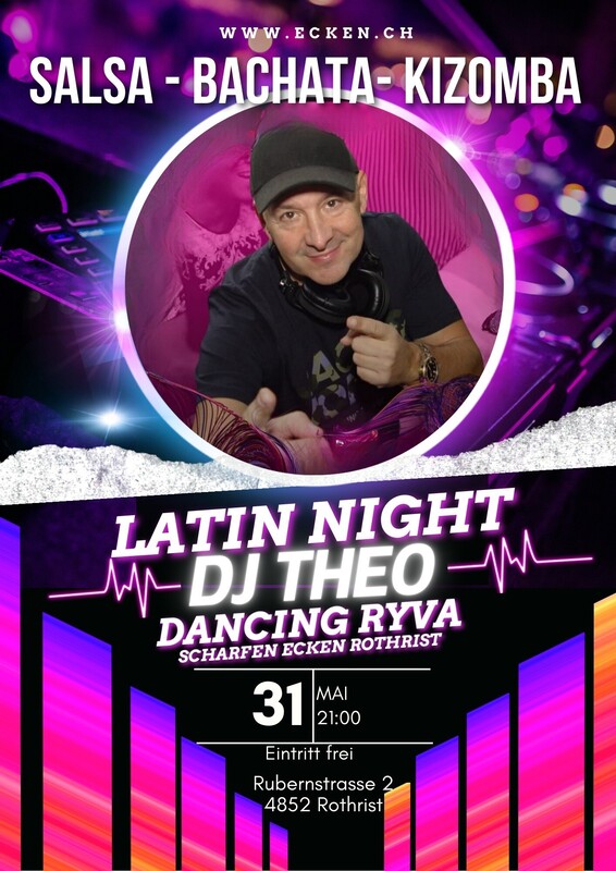 Freitag 31. MAI 2024 ab 21h. IMMER DER LETZTE FREITAG VON JEDEN MONAT Eintritt ist Frei ★ SALSA & FIESTA ★ Herzlich Willkommen ins Dancing RYVA im Scharfen Ecken SALSA ALL STYLES - BACHATA - LATIN HITS ★ ★ DJ THEO ★ ★ ---------------------------------------- ★ PROGRAMM: 21:00 Uhr bis 02 Uhr Salsa Party mit DJ THEO Grosse Parkett Tanzboden ---------------------------------------- ★ Frei Eintritt ---------------------------------------- ★ 280 Gratisparkplätze ★ 3 minuten von Autobahn Ausfahrt Rothrist ★ 35 min. ab Luzern, 40 min. ab Zürich, 30 min. ab Basel, 40 min. ab Bern ★ Pizzeria The Fratelli & Restaurant Scharfen Ecken ---------------------------------------- ★ Nach dem Essen im Restaurant oder in der Pizzeria The Fratelli schenken wir Ihnen den Eintritt für jeweils Dienstag, Freitag oder Samstag. ---------------------------------------- DANCING RYVA zum scharfen ecken Rubernstrasse 2 I 4852 Rothrist I Kanton Aargau I www.ecken.ch Dancing RYVA im Scharfen Ecken ★ Der Ort wo man sich trifft, tanzt und flirtet. Erleben Sie schöne und glückliche Momente. Wir freuen uns auf Euren Besuch Euer RYVA TEAM – Scharfen Ecken Rothrist 🎉 Latino Night im Dancing RYVA! 🎉 Sei Teil einer unvergesslichen Latin Night, präsentiert von DJ Theo! 🔥🎶 Genieße eine heiße Mischung aus Salsa, Bachata, Kizomba und den besten Latin Charts. 🕺💃 Wir bieten dir eine riesige Tanzfläche, um deine Moves zu zeigen und die Nacht durchzutanzen. 🌟 Die Party startet um 21:00 Uhr und geht bis 02:00 Uhr. Der Eintritt ist Frei. Wir sehen uns im Dancing RYVA, Scharfe Ecken, Rothrist. Markiere deine Freunde und sei dabei! https://www.facebook.com/events/737791464912317/