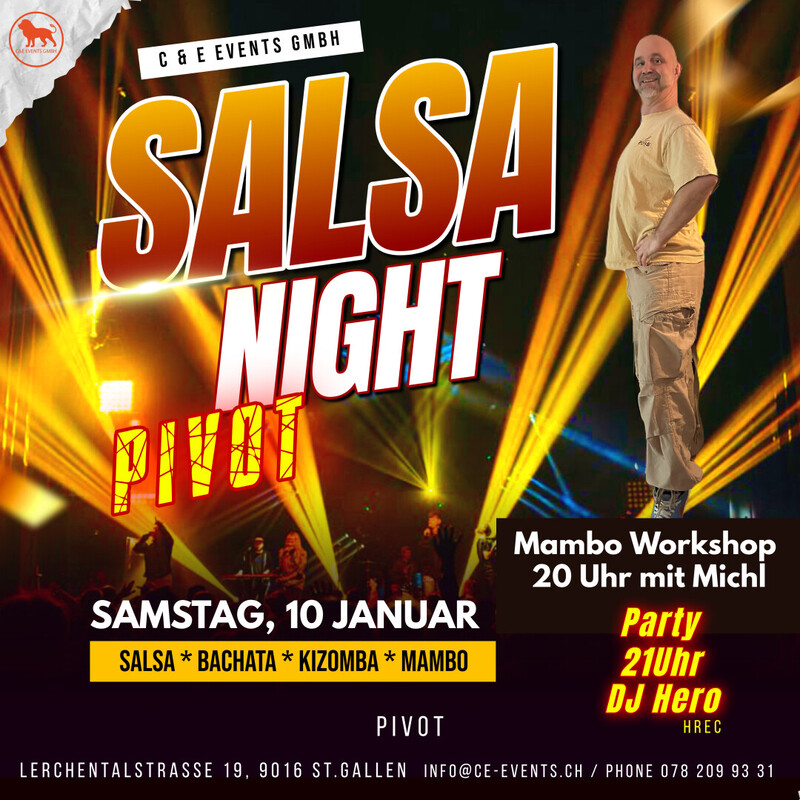 Lasst uns abtanzen und das Leben feiern am Samstag den 10. Januar im Pivot in St.Gallen!! 20 Uhr Mambo Workshop mit Michl Party ab 21.00 Uhr mit DJ Hero Salsa Bachata Kizomba Mambo 1 Workshop 15 CHF / Nur Party: 10 CHF Anmeldung erwünscht!! Zahlungsmöglichkeit: Twint oder Cash. Keine Kartenzahlung möglich!! Workshop Anmeldung und Infos: Phone 078 209 93 31 oder per Mail an info@ce-events.ch Parkplätze vor dem Haus und weitere an der Lerchentalstrasse 21 beim Stoffwechselzentrum Gästeparkplätze, weitere Gästeparkplätze auf dem Kiesplatz bei Altrimo und Stoffwechselzentrum!! Wir freuen uns auf einen schönen Abend mit euch!! www.ce-events.ch