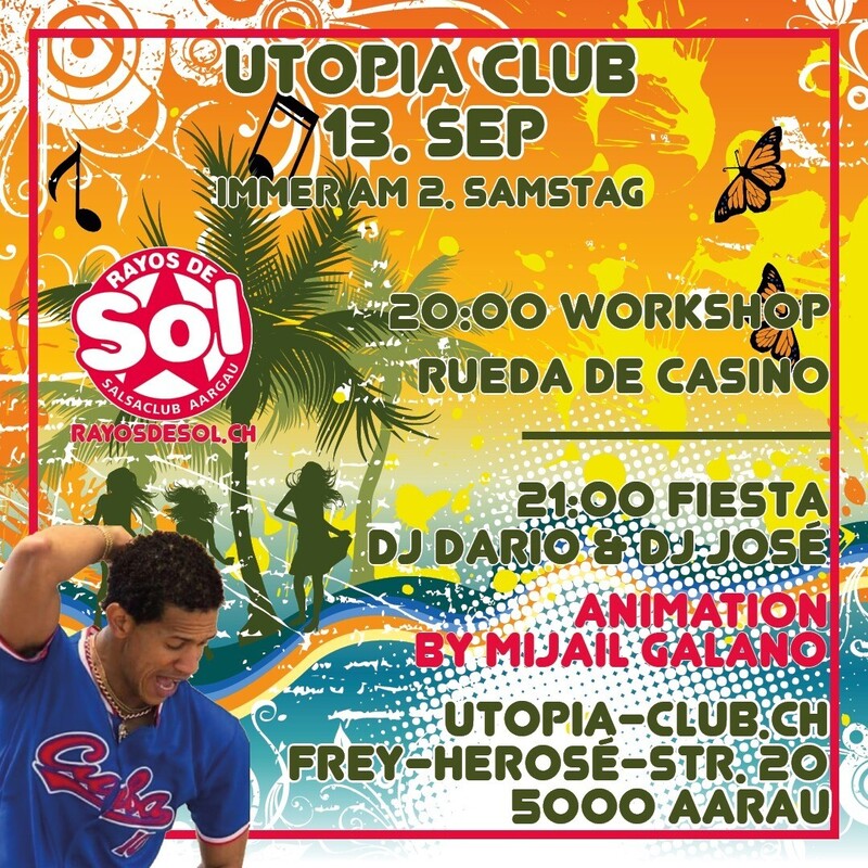 Salsa Club Aargau "Rayos de Sol", präsentiert in Zusammenarbeit mit dem wohl legendärsten Club von Aarau (Club Utopia) - die "Salsa Night". Ven a gozar de la buena musica cubana. Mit DJ Dario & DJ José Animation mit Mijail Galano Wir freuen uns. 20:00 Uhr Workshop "Rueda de Casino" mit Mijail Galano (Cuba) 21:00 Uhr Salsa Party mit DJ Dario & DJ José Animation; "Mijail Galano" (Cuba) Preise 15.- Rueda de Casino - Workshop mit Mijail Galano 18.- Party (Mitglieder von "Rayos de Sol" 13.-) Inkl. Garderobe www.rayosdesol.ch