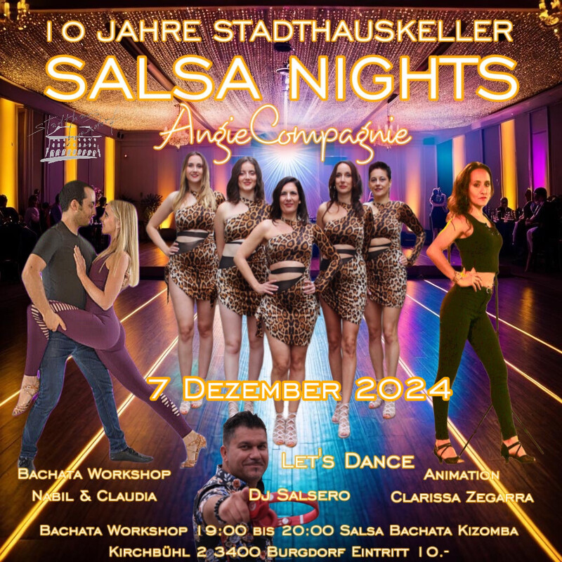 10 Jahre Salsa Nights Bachata Workshop mit Nabil & Claudia 19:00 bis 20:00 Show by AngieCompagnie Animation by Clarissa Zegarra Musik by DJ Salsero Salsa Bachata Kizomba Welcome Drink Let's Dance Eintritt 10.-