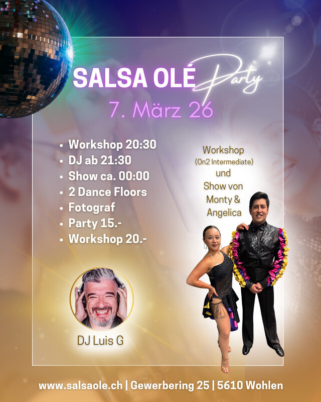 Salsa Olé Party mit DJ & Show & WS - Workshop um 20.30 Uhr - Partystart um 21.30 Uhr mit DJ - Show um ca. 00:00 Uhr 𝗣𝗿𝗲𝗶𝘀𝗲 Party CHF 15.- Workshop CHF 20.- 𝗜𝗻𝗳𝗼𝘀 𝘂𝗻𝗱 𝗔𝗻𝗺𝗲𝗹𝗱𝘂𝗻𝗴 info@salsaole.ch 076 323 98 81 www.salsaole.ch