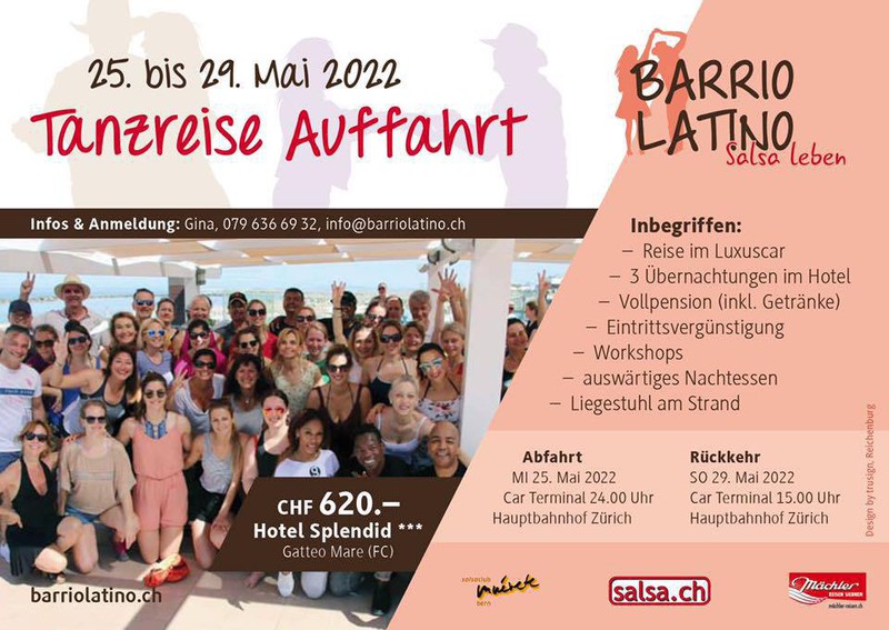 Abfahrt: 25.Mai Zeit 24:00 Car Terminal Zürich Rückkehr: 29 Mai CA. 15:00 Car Terminal Zürich Preis : 620.- Für Weitere Infos: Gina Troiano Wiesriedtweg 5 8630 Rüti 079 636 69 32 info@barriolatino.ch www.barriolatino.ch