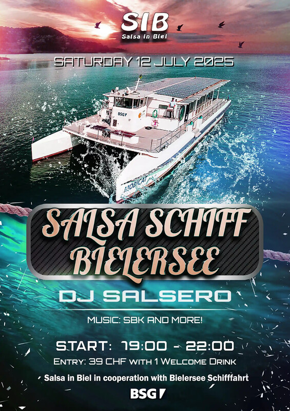 Noche Caliente auf dem Wasser! Tanzen zu den Rhythmen Lateinamerikas, aufgelegt von DJ SALSERO – erleben Sie mit uns und der Tanzschule Salsa in Biel einen unvergesslichen Abend mit heissen Rhythmen und kühlen Drinks. Sowohl Singles als auch Paare sind herzlich willkommen. • Eintritt CHF 39.- inkl. Fahrt, Tanz und Welcomedrink • Boarding: 18:45 • DJ: DJ SALSERO • Musik: Salsa. Bachata, Kizomba and more! • Durchgeführt: BSG + SIB • Plätze sind begrenzt! • Veranstaltungsort: BSG, Badhausstrasse 1a, 2501 Biel • Anfahrt: Plan • Weitere Informationen und Buchung unter: BSG WICHTIG! Es gibt keine Abendkasse! Reservation nur übers Internet. ⚓⚓⚓⚓⚓⚓⚓⚓⚓⚓⚓⚓⚓⚓⚓⚓⚓⚓⚓⚓⚓⚓⚓⚓ Noche Caliente sur l’eau! Des musiques sud-américaines, avec aux platines DJ SALSERO, pour vous emmener sur la piste de danse! Une soirée inoubliable vous attend en compagnie de l’école de danse Salsa Bienne. Des rythmes chauds et des boissons bien frappées – les couples autant que les célibataires y trouvent leur compte. • Entrée: CHF 39.- incl. croisière, musique, danse et verre de bienvenue • Boarding: 18h45 • DJ: DJ SALSERO • Music: Salsa, Bachata, Kizomba and more! • Organisateur: BSG + SIB • Les places sont limitées! • Lieu: BSG, Rue des Bains 1a, 2501 Bienne • Directions: Carte • Plus d'informations et réservation: BSG IMPORTANT! Il n’y a pas de billetterie! Réservation uniquement par internet. https://www.salsainbiel.ch/fr/salsa-schiff-12-07-2025/