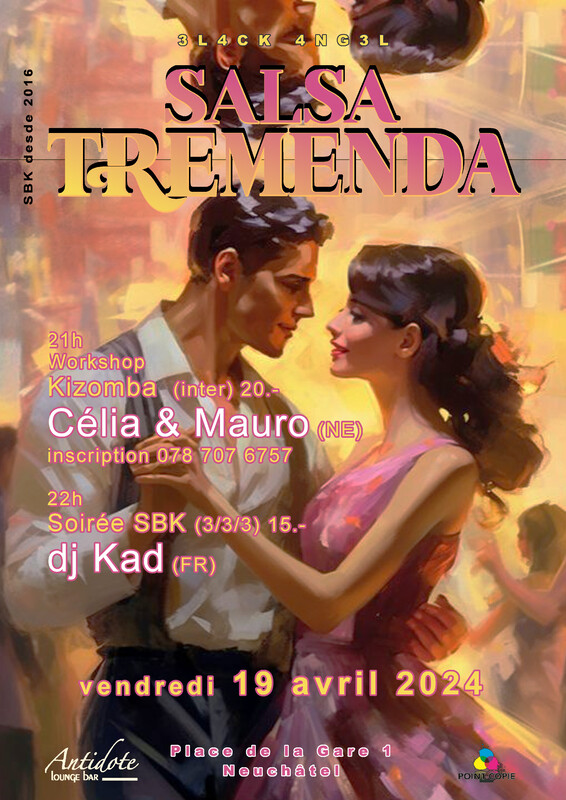 Salsa TREMENDA | 19 avril 2024 21h CÉLIA & MAURO (NE) Kizomba inter (20CHF) inscription 078 707 6757 22h DJ KAD (FR) Soirée SBK (15CHF)