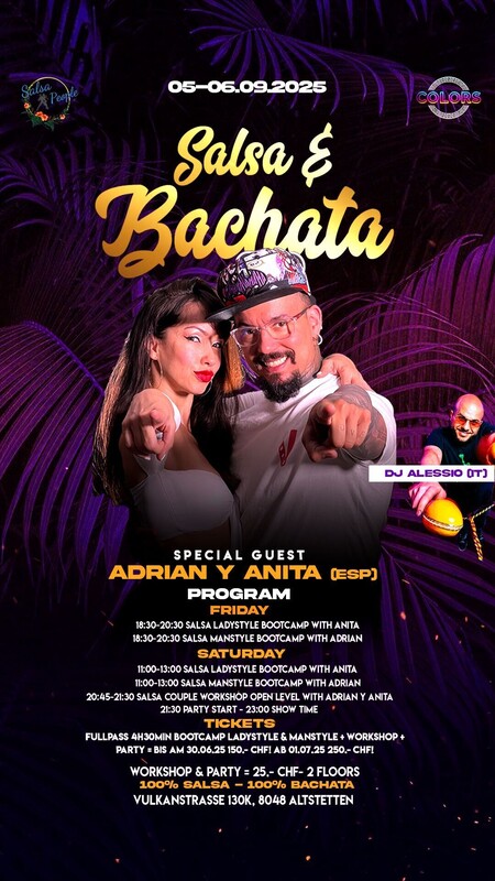 SAMSTAG, 06.09.2025 SALSA & BACHATA EVENT *** SALSA | BACHATA *** *** 2 DANCE FLOORS *** *** SPECIAL GUEST ADRIAN Y ANITA (ESP) *** *** 4H INTENSIVE BOOTCAMP*** *** 1 WORKSHOP *** *** 2 SHOWS *** *** DJ Alessio (IT)*** BOOTCAMP PLAN: 05.09.2025 - LADY & MANSTYLE BOOTCAMP 18:30 - 20:30 06.09.2025 - LADY & MANSTYLE BOOTCAMP 11:00 - 13:00 WORKSHOP PLAN 20:45-21:30 SALSA COUPLE OPEN LEVEL WITH ADRIAN & ANITA ( ESP) PARTY START - 21.30Uhr SHOW TIME - 23:00 Lass dich entführen und geniesse die atemberaubende Magie der neuen Event Location im Stadion der SWISS LIFE ARENA In Zürich! Es erwartet dich ein Spektakel mit bezaubernden Shows im THE COLORS . === THE COLORS === Vulkanstrasse 130 | 8048 Zürich - Swiss life Arena https://eventfrog.ch/de/p/party/latin-brasil/salsa-bachata-event-7326510456683655654.html