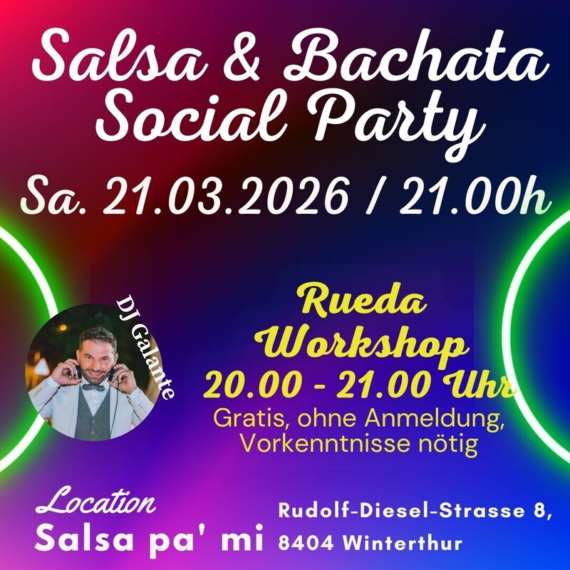 Salsa-/Bachatafloor (50% Salsa / 50% Bachata) Wo: Studio Salsa pa' mi, Rudolf-Diesel-Strasse 8, 8404 Winterthur Wann: Samstag, 21.03.2026 Zeit: ab 21:00 Uhr Social Dancing Eintritt Workshop & Social Party: 15.00 CHF | EC oder Barzahlung! Parkieren: Parkplätze in naher Umgebung vorhanden. +++++++ WORKSHOP | Salsa oder Bachata (siehe sep. Flyer) | kostenlos! Vorkenntnisse nötig! Ohne Anmeldung, einfach vorbei kommen! Wo: Studio Salsa pa' mi, Rudolf-Diesel-Strasse 8, 8404 Winterthur Wann: Samstag, 21.03.2026 Zeit: 20:00 Uhr Kosten Workshop: gratis Vorkenntnisse: Vorkenntnisse nötig! Anmeldung: keine Anmeldung erforderlich https://salsapami.ch/dxevent/fruehlingsparty-2026/ https://salsapami.ch/dxevent/fruehlingsparty-2026/