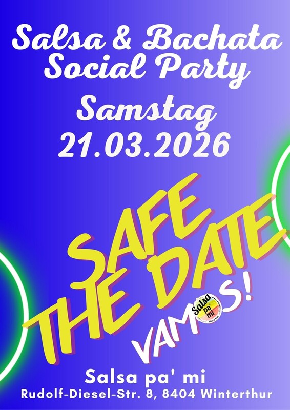 Salsa-/Bachatafloor (50% Salsa / 50% Bachata) Wo: Studio Salsa pa' mi, Rudolf-Diesel-Strasse 8, 8404 Winterthur Wann: Samstag, 21.03.2026 Zeit: ab 21:00 Uhr Social Dancing Eintritt Workshop & Social Party: 15.00 CHF | EC oder Barzahlung! Parkieren: Parkplätze in naher Umgebung vorhanden. +++++++ WORKSHOP | Salsa oder Bachata (siehe sep. Flyer) | kostenlos! Vorkenntnisse nötig! Ohne Anmeldung, einfach vorbei kommen! Wo: Studio Salsa pa' mi, Rudolf-Diesel-Strasse 8, 8404 Winterthur Wann: Samstag, 21.03.2026 Zeit: 20:00 Uhr Kosten Workshop: gratis Vorkenntnisse: Vorkenntnisse nötig! Anmeldung: keine Anmeldung erforderlich https://salsapami.ch/dxevent/fruehlingsparty-2026/