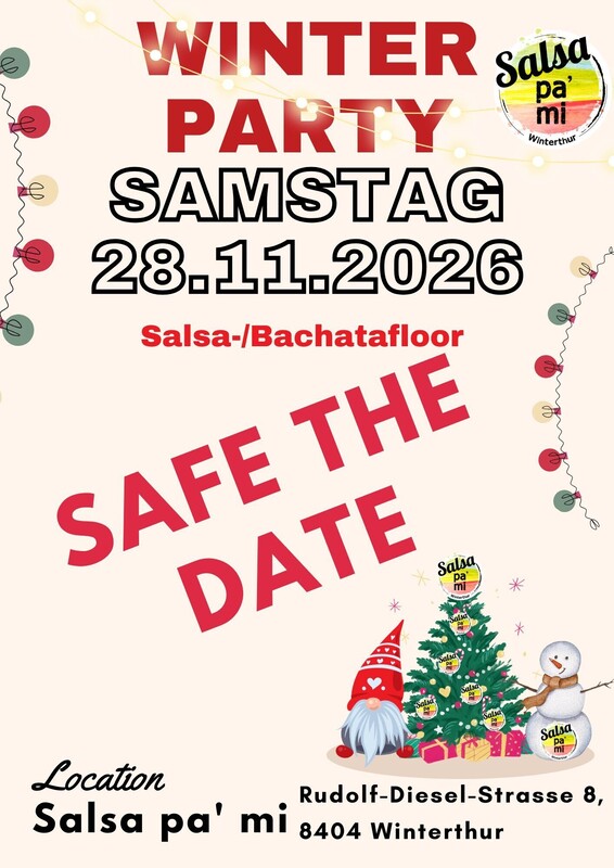 Salsa-/Bachatafloor (50% Salsa / 50% Bachata) Wo: Studio Salsa pa' mi, Rudolf-Diesel-Strasse 8, 8404 Winterthur Wann: Samstag, 28.11.2026 Zeit: ab 21:00 Uhr Social Dancing Eintritt Social Party: 15.00 CHF | EC oder Barzahlung! Parkieren: Parkplätze in naher Umgebung vorhanden. +++++++ WORKSHOP | Salsa oder Bachata (siehe sep. Flyer) | kostenlos! Vorkenntnisse nötig! Ohne Anmeldung, einfach vorbei kommen! Wo: Studio Salsa pa' mi, Rudolf-Diesel-Strasse 8, 8404 Winterthur Wann: Samstag, 28.11.2026 Zeit: 20:00 Uhr Vorkenntnisse: Vorkenntnisse nötig! Anmeldung: keine Anmeldung erforderlich https://salsapami.ch/dxevent/winterparty-2026/