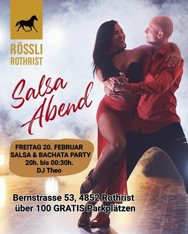 NEU Salsa & Bachata-Tanzabende im Rössli-Saal mit DJ Theo 20:00 Uhr bis 00:30 Uhr - Eintritt 10.- Warme Küche von 18:00 bis 21:00 Uhr Tischreservierung: Tel. Nr.: 062 794 15 15 SAAL Mit 180m2 Saalfläche, 80m2 Bühne ,100 Gratis Parkplätze, dem offenen Raum dank Galerie und hoher Decke eignet sich der Rössli-Saal für Salsa & Bachata-Tanzabende. Der Saal, wie auch die klassischen Gaststuben im Haus versprühen klassische Gastfreundschaft. Das Rössli ist heute eines der grössten Restaurants der Region und zeichnet sich durch eine gutbürgerliche Küche, gelebte Gastfreundschaft und ideale Räumlichkeiten für verschiedenste Veranstaltungen aus. Über 100 GRATIS Restaurant-eigene Parkplätze ADRESSE Restaurant Rössli Rothrist Bernstrasse 53, 4852 Rothrist INFOS www.roessli-rothrist.ch ANFAHRT Das Rössli ist sowohl mit Auto dank bester Verkehrsanbindung an die A1, wie auch mit dem öffentlichen Verkehr einfach zu erreichen. Auf der gegenüberliegenden Strassenseite des Restaurants verfügen wir über 100 GRATIS Restaurant-eigene Parkplätze. Die Bushaltestelle «Rothrist, Rössli» befindet sich direkt vor dem Haus. FACEBOOK https://fb.me/e/3Zx43xku1