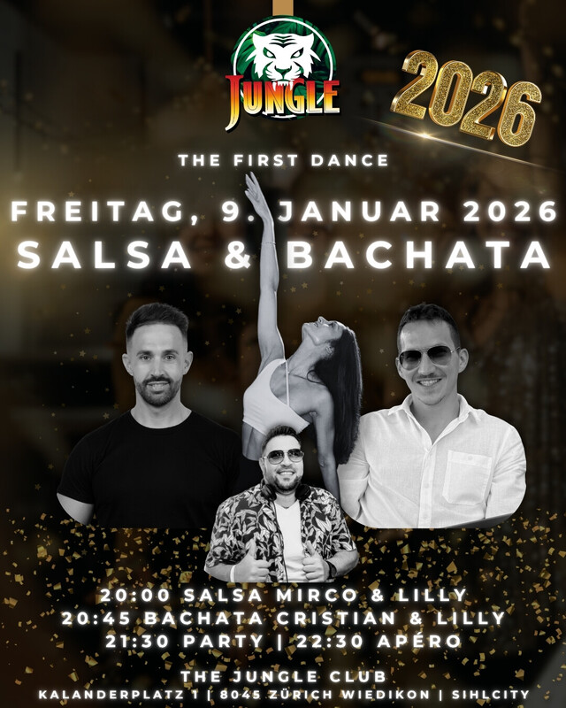 THE FIRST DANCE FREITAG, 9. JANUAR 2026 Jetzt ist es so weit🔥 Wir öffnen wieder unsere Türen für das erste Salsa & Bachata Event 2026❗ Lasst uns die guten Vorsätze direkt in die Tat umsetzen und gemeinsam die erste Nacht des neuen Jahres durchtanzen🥳🪩 ✨ Line-up: 💃 Salsa Workshop 🕺 Bachata Workshop 🥪 Apéro 🎶 Salsa Floor 🎶Bachata Floor 🎧 DJ Maikiu 🕒 Timetable: 20:00 Salsa Workshop 20:45 Bachata Workshop 21:30 Party 22:30 Apéro 🎟 Tickets: 👉 15 CHF ❗Ein Ticket für alles Workshops | Animation | Party | Apéro www.thejungleclub.ch