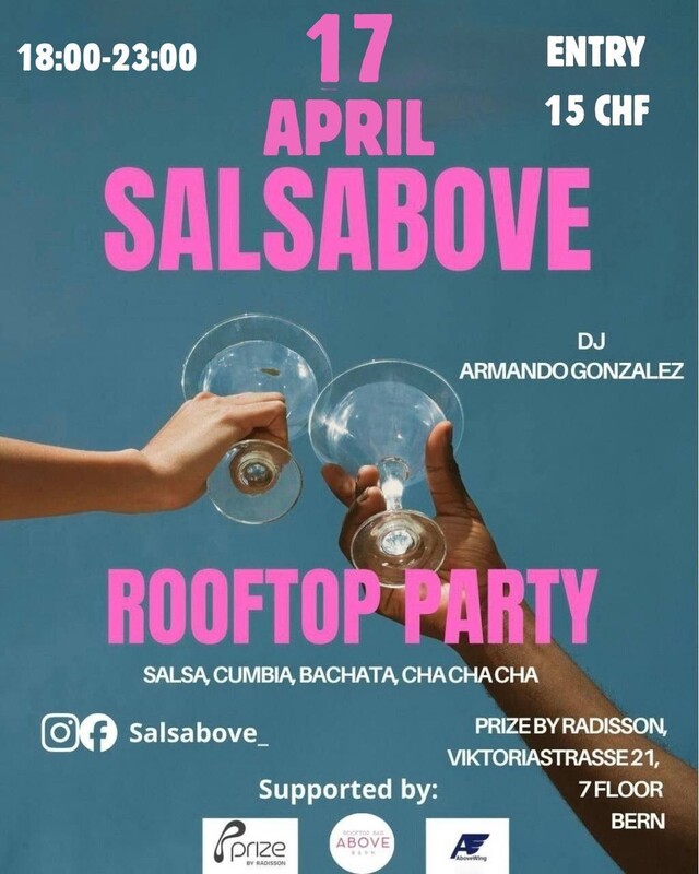 SalsAbove: the Latin american Party on the rooftop of Bern! Join us for an evening of Latin American music and dance on the rooftop of Bern! Our DJ and teacher will keep you dancing all night long with the best rhythms of salsa, bachata, Cha-Cha-Cha, merengue, and cumbia. Details: - Date: Friday, 17th April, 2026; - Time: 18:00 - 23:00 ; - Location: PrizeHotel Viktoriastrasse 21, 7 floor Bern, 5 minutes by bus (n° 10, stop: Schönbug) from Bern train station; - Safe parking available for 6 CHF all evening ( or blue line's parking around the location); - Rain? No worries, if will rain the party will be held indoors ( during the winter the party will be inside but the terrace will stay open for enjoying the view with a drink and smoking); - 15chf entry; Contacts: For more information, contact us on Instagram or write to info@salsabove.com Don't miss the chance to dance with us in this exclusive location! Best regards, Andrea from SalsAbove Ps Periodically we organize new parties for our community in other rooftops and locations, for example in the "SalsAbove Last Minute" we'll let know location and time the day before just on Instagram, Fb and on the website. Follow us on IG at this link or for sure you'll lose these parties; www.salsabove.com