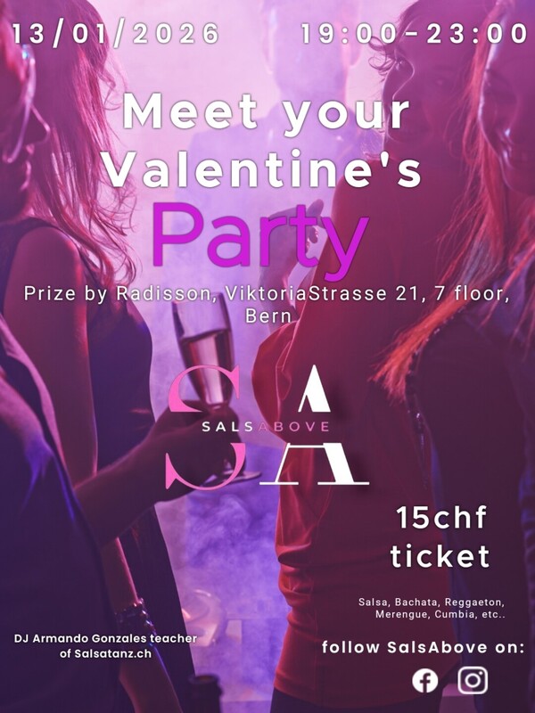 SalsAbove: the Latin american Party on the rooftop of Bern! This time the evening before Valentine's day, oriented to all the people that still didn't find a life partner. Join us for an evening of Latin American music and dance on the rooftop of Bern! Our DJ and teacher will keep you dancing all night long with the best rhythms of salsa, bachata, Cha-Cha-Cha, merengue, reggaeton and cumbia. Details: - Date: Friday, 13th February, 2026; - Time: 19:00 - 23:00 ( maybe more); - Location: PrizeHotel Viktoriastrasse 21, 7 floor Bern, 5 minutes by bus (n° 10, stop: Schönbug) from Bern train station; - Safe parking available for 6 CHF all evening ( or blue line's parking around the location); - Rain? No worries, the party will be held indoors ( during the winter the party will be inside but the terrace will stay open for enjoying the view with a drink and smoking); - 15chf entry with twint, card or cash; Contacts: For more information, contact us on Instagram or write to SalsAbove@gmail.com Don't miss the chance to meet your perfect partner and dancing with us in this exclusive location! Best regards, Andrea from SalsAbove Ps Periodically we organize new parties for our community in other rooftops and locations, for example in the "SalsAbove Last Minute" we'll let know location and time the day before just on Instagram and Fb. Follow us on IG at this link or for sure you'll lose these parties; https://www.instagram.com/salsabove_?igsh=MWJsYjBneGJ5c2My