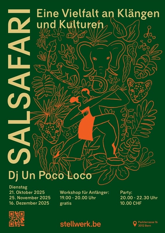 đŽ Salsa Safari â Eine Vielfalt an KlĂ€ngen und Kulturen Erlebe eine unvergessliche Nacht voller Rhythmus, Energie und Lebensfreude! Tauche ein in die Welt des Salsa â begleitet von DJ Un Poco Loco, der mit feurigen Beats aus Lateinamerika fĂŒr tropische Stimmung sorgt. Ob AnfĂ€nger:in oder Salsa-Profi â alle sind willkommen! Vor der Party gibtâs einen gratis Workshop fĂŒr Einsteiger:innen, damit du gleich mittanzen kannst. đ Daten: Dienstag, 21. Oktober 2025 Dienstag, 25. November 2025 Dienstag, 16. Dezember 2025 đ Ablauf: Workshop fĂŒr AnfĂ€nger:innen: 19.00 â 20.00 Uhr (gratis) Bitte melde dich fĂŒr den Event mit Angabe deines Namens an. Du brauchst keine:n Tanzpartner:in, um mitzumachen. Party: 20.00 â 22.30 Uhr (Eintritt 10 CHF) đ Ort: Stellwerk, Parkterrasse 16, 3012 Bern (im 3. OG des Hauptbahnhofs) đ¶ DJ: Un Poco Loco Komm vorbei, lass dich von den lateinamerikanischen KlĂ€ngen verzaubern und tanze dich in gute Laune â mitten in Bern! đđș đ Mehr Infos: stellwerk.be https://www.stellwerk.be/