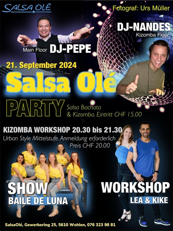Salsa Olé Party mit DJ & Show & WS Partystart um 21.30 Uhr Preise Party und Workshop CHF 30.00 nur WS CHF 25.00 nur Party CHF 15.00 Infos und Anmeldung info@salsaole.ch 076 323 98 81 www.salsaole.ch