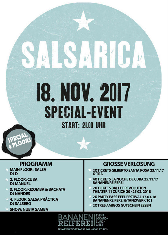 SALSARICA Presents: Heimspiel No. 13 - Winter Breeze Party *** Doors: 21:00UHr *** > MAIN FLOOR: SALSA DJ d ***** > 2. FLOOR: CUBA DJ Manue ****** > 3. FLOOR: KIZOMBA & BACHATA Dj Nandes ****** > 4.FLOOR: SALSA PRACTICA Dj Salsa ia Samba *** GROSSE VERLOSUNG 2x TICKETS: GILBERTO SANTA ROSA 23.11.17 X-Tra 4x TICKETS: LA NOCHE DE CUBA 25.11.17 Bananenreiferei 2x TICKETS: BALLET REVOLUTION 20-25 02.2018 Theater 11 ZH 2x PARTY PASS **FEEL FESTIVAL** 17-18.03.18 Bananenreiferei & Tanzwerk 101 2x Tres Amigos Gutscheinn Essen *** Eintritt CHF 20.- *** Bananenreiferei Pfingstweidstrasse 101, 8005 Zúrich