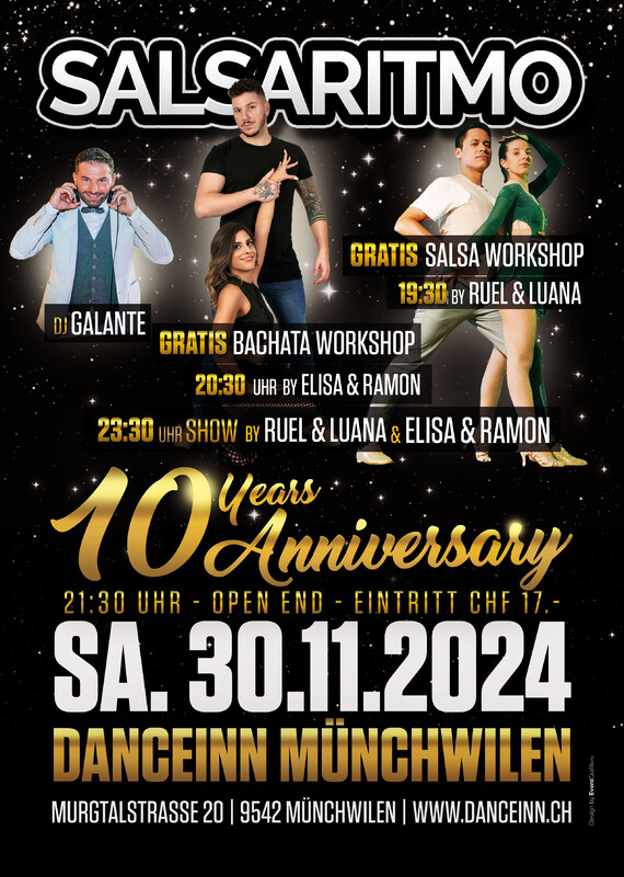 Die grosse Geburtstagsparty im DanceInn Münchwilen! Das Label SALSARITMO wird 10 Jährig und wir feiern dies mit 2 gratis WORKSHOP‘s & 2 SHOW’s 🥳🥂.. Programm: 🔘19:30H - Gratis SALSA Workshop by RUEL & LUANA💃🏻🕺🏾🔥.. 🔘20:30H - Gratis BACHATA Workshop by ELISA & RAMON💃🏻🕺🏾🔥.. 🔘21:30 - Party Open End, Party & Tanzen bis die Schuhe glühen... 🔘23:30 - SHOW’s by RUEL & LUANA / ELISA & RAMON 🔘DJ: GALANTE🎧 Wir freuen uns auf eine Super Party 🥳 und EUCH wieder an der SALSARITMO zu begrüssen🤗🥰..