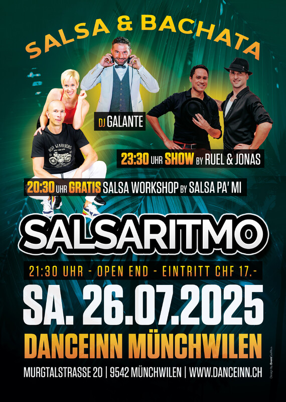 🔥SALSARITMO🔥 Die beliebte SALSA & BACHATA Party der Ostschweiz🥳. Geniesse das einzigartige Ambiente und die tolle Stimmung im Dance Inn Münchwilen💃🏻🕺🏾♥️.. 🔘20:30H - 21:30H Gratis SALSA Workshop by SALSA PA'MI💃🏻🕺 🔘21:30H - Open End, Party & Tanzen bis in die Morgenstunden🥂.. 🔘23:30H SHOW RUEL & JONAS💥 🔘DJ: GALANTE🎧 Wir freuen uns auf einen coolen SALSA Workshop von Salsa Pa’Mi, auf eine Super SHOW von unseren Lokal-Matadoren sowie eine tolle Party🥳🥂..