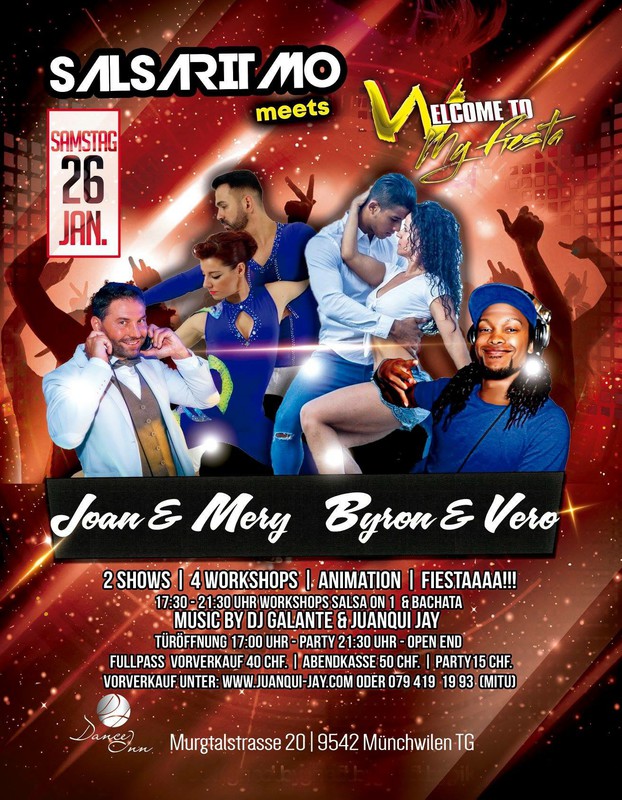4 Deluxe Gäste aus Spanien🇪🇸 4 Stunden Workshops💃🏻🕺🏾 2 Grossartige Shows ❗️ Beste Musik🎶 Tolles Ambiente❤️ das alles kann nur eines heissen FIEEESTAAA A LO GRANDE! ★ PROGRAMM 17:30 -21:30 Uhr 4 Workshops mit Künstlern aus Spanien 🇪🇸 * Salsa On1 - Mittelstufe Joan & Mery 17:30-18:30 *Bachata Sensual - Mittelstufe Byron & Vero 18:30-19:30 *Salsa Fortgeschritten Byron & Vero 19:30-20:30 * Bachata Fusion Fortgeschritten Joan & Mery 20:30-21:30 Party 💃🏻🕺🏾🍹21:30 Uhr - Open End... ❗️23:30 Uhr Show Time mit Joan & Mery | Byron & Vero 🎶Music by: DjGalante & Juanqui Jay Salsa All Styles - Bachata - Kizomba ★ PREIS Vorverkauf Fullpass 40 chf. (4 Workshops + Shows + Party) Abendkasse Fullpass 50 chf. Party 15 chf. ★TICKETS UNTER: www.juanqui-jay.com/welcome-to-my-fiesta Oder 079 419 19 93 (Mitu) DANCE INN Murgtalstrasse 20 9542 Münchwilen A BAILAR & GOZARRR SE FORMÓ EL RUMBÓN!!!