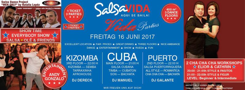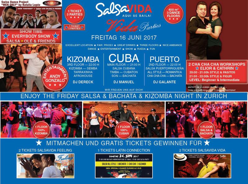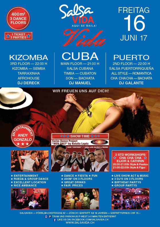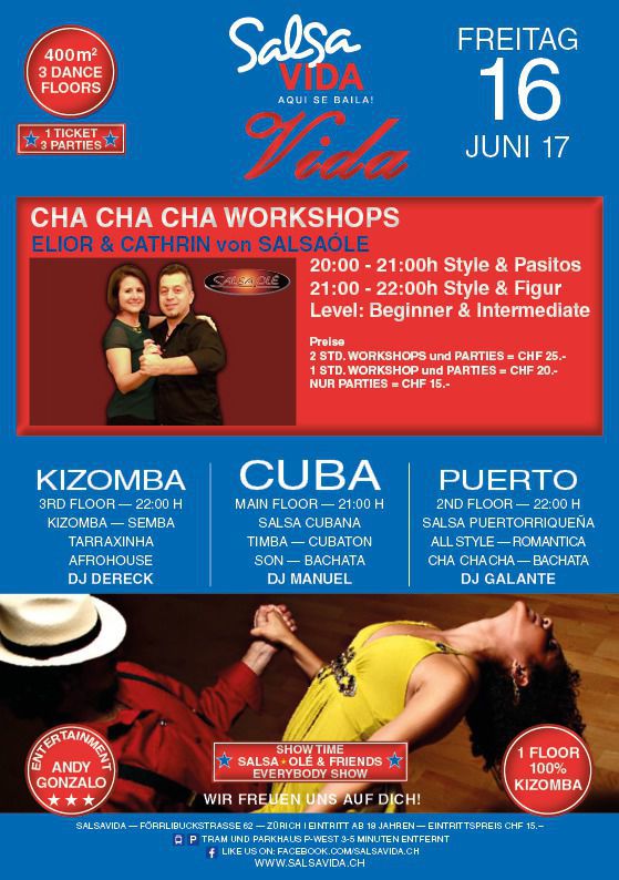 ★★★Friday Night is SALSAVIDA Night★★★ WITH 2 CHA CHA CHA WORKSHOPS FROM 20:00 h - 22:00 h Event on Facebook: https://www.facebook.com/events/1921202274792687/ 1 Ticket = 3 Parties!!! ★★★★ VIDA PARTIES ★★★★ ★ CUBA ★ PUERTO RICAN ★ KIZOMBA ★ BACHATA ▶ 16 JUNI 2017 ab 21:00 H / SALSAVIDA / ZÜRICH◀ ★ 2 CHA CHA CHA WORKSHOPS AB 20:00 H ★ Main Floor CUBA VIDA ab 21:00 H ● MUSIC BY DJ MANUEL (Cuba) ★Salsa Cubana ★Timba ★Son ★Cubaton ★Bachata ● SHOW TIME by SALSAOLÉ EVERYBODY SHOW ● ENTERTAINMENT BY ANDY GONZALO (Cuba) 2nd Floor PUERTO VIDA ab 22:00 H ● MUSIC BY DJ GALANTE ★Salsa Puertorriqueña ★ALL Style ★Romantica ★Cha cha cha ★Bachata Sensual 3rd Floor KIZOMBA VIDA ab 22:00 H ● MUSIC BY DJ DERECK ★Kizomba ★Tarraxinha ★Semba ★Afrohouse VERLOSUNG: ★ 2 TICKETS FÜR SALSAVIDA PARTY ★ 1 TICKET FÜR LATIN CONNECTION PARTY 24.06.2017, Volkshaus Zürich ★ 2 STUNDEN WORKSHOPS MIT ELIOR & CATHRIN VON SALSAOLÉ ★ 20:00 H - 21:00 H CHA CHA CHA Style & Pasitos 21:00 H - 22:00 H CHA CHA CHA Style & Figur LEVEL: Beginners & Intermediate PREIS 2 STD. WORKSHOPS und PARTIES = CHF 25.- 1 STD. WORKSHOP und PARTIES = CHF 20.- NUR PARTIES = CHF 15.- ● 400m2 PISTA ● 3 DANCE FLOORS ● 3 TOP DJ’S ● 2 BARS ● EXCELLENT LOCATION ● NICE AMBIANCE ● FAIR PRICES ● GREAT DRINKS ● DANCE ● ENTERTAINMENT ● SHOWS ● RUEDA ● FUN ● FIESTAAA! DON’T MISS IT!!! Eine unvergessliche Tanznacht, Spass, Freude und Unterhaltung ist dabei garantiert! Eintritt CHF 15.- Wir freuen uns auf DICH! SALSAVIDA aqui se bailaaa! Saludos Francesco & Salsavida Team Anfahrtsplan Salsavida Förrlibuckstrasse 62 in 8005 Zürich. Achtung: Für Salsavida Gäste, die mit dem Auto anreisen, bitte unbedingt das "Parkaus West" oder "Parkhaus Toni Areal" benutzen, da auf dem Salsavida und Club Silbando-Areal nicht überall geparkt werden darf. Tram Mit dem Tram findest du folgt zu uns: - Nr. 17 bis Förrlibuckstrasse - Nr. 4, 10, 11, 13, 15, 17 bis Escher-Wyss-Platz - Nr. 4 bis Technopark Bus Folgende Busse führen ebenfalls an die Förrlibuckstrasse: - Nr. 32, 33, 34, 46, 72 bis Escher-Wyss-Platz S-Bahn - Nr. 5, 6, 7, 9, 12 bis Bahnhof Hardbrücke Parkmöglichkeiten - Parkhaus Zürich-West an der Förrlibuckstrasse 151 - Parkhaus Toni Areal an der Pfingstweidstrasse 94 - West-Park an der Giessereistrasse - unter der Hardbrücke etc. Wieviele Gehminuten dauert es zum SALSAVIDA? - Escher-Wyss-Platz Salsavida 6 Minuten - Technopark Salsavida 6 Minuten - Parkhaus Toni Areal Salsavida 3 Minuten - Parkhaus Zürich-West Salsavida 4 Minuten - Bahnhof Hardbrücke Salsavida 12 Minuten