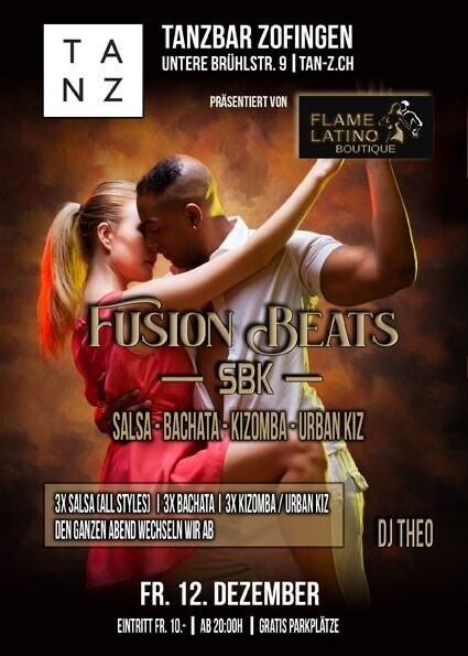 Erlebe den Abend der 3 Tänze! Salsa • Bachata • Kizomba / Urban Kiz DJ Theo verleiht dem Abend mit seinem Sound eine ganz besondere Magie – spür die Musik, fühl den Moment! ✨ Tauche ein in eine faszinierende Fusion, bei der sich verschiedene Tanzstile zu einem unvergesslichen Erlebnis vereinen. Ein Abend voller Leidenschaft, Rhythmus und Bewegung Wechsle durch den Abend mit: 3 x Salsa All Styles 3 x Bachata 3 x Kizomba / Urban Kiz ⸻ Lass dich verzaubern von der Boutique Flame Latino! Im Obergeschoss erwartet dich eine Welt voller Eleganz, Leidenschaft und Stil. Entdecke exklusive, bequeme und einzigartige Tanzschuhe für Damen und Herren – perfekt für jedem jeden Tanzmoment. Nur an diesem besonderen Abend profitierst du von einzigartigen Angeboten! Finde zudem wunderschöne Accessoires und Schmuckstücke, die als ausgestellte Einzelstücke perfekt zu deinem Event passen. ⸻ 🎁 Lass dich überraschen! Freu dich auf tolle Verlosungen mit attraktiven Gutscheinen für: Tanzkurse Tanzschuhe Schmuck & Accessoires Entspannung