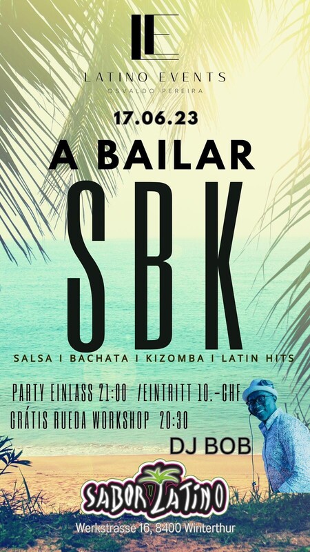 SBK-Party im Sabor Latino Tanzt, feiert und geniesst einen leidenschaftlichen Abend voller Lebensfreude an der Salsa, Bachata und Kizomba Party im Sabor Latino in Winterthur! Liebhaber der Latino-Szene finden in der tollen Atmosphäre dieser Location Freude und Spass unter Tanzbegeisterten. Lasst euch in die feurige Welt der Salsa, Bachata und Kizomba, mit Top DJ’s entführen und mit leckeren Cocktails verwöhnen. Kommt vorbei und verbringt einen wundervollen Abend mit uns! Mainfloor: DJ Bob Salsa / Bachata / Kizomba 20:30 - 21:30 Uhr Rueda Workshop mit Franz Wir freuen uns auf euch! Weitere Infos für die SBK-Party: Genügend freie Parkplätze vor dem Club. Es darf auf allen freien Flächen auf dem Gelände geparkt werden. Nur die Plätze vor den beiden Häusern links nach der Einfahrt in die Werkstrasse und die mit “Borsalino” gekennzeichneten Plätze visavis vom Sabor Latino sind tabu. Mehr über den Club erfährst Du hier: Im Club Sabor Latino wird die Nacht zum einmaligen Event. Der Club Sabor Latino ist leicht erreichbar mit dem ÖV und vor dem Club gibt es gratis Parkplätze. www.saborlatino.ch