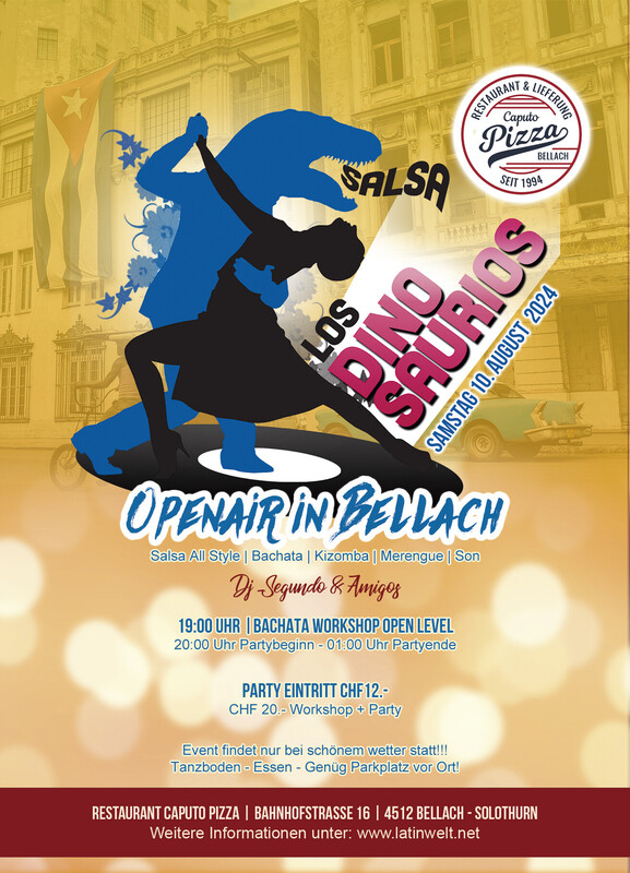 Salsa, Bachata, Kizomba und mehr! OPENAIR IN BELLACH - SOLOTURN Tanzboden - Event findet nur bei schönem Wetter statt! 19:00 - 20:00 Uhr Bachata Workshop Open Level 20:00 - 01:00 Uhr Party CHF 12.- Party Eintritt CHF 20.- Workshop + Party Weitere Informationen: - Genug Parkplätze vor Ort! - Tanzboden - 15 Min. zu Fuss von Bahnhof Bellach - 5 Min. mit dem Auto von Solothurn