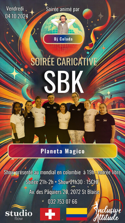 Come, support and encourage our group "INCLUSIF 🇨🇭" This group is made up of dancers with and without disabilities. Together they have the exciting opportunity to represent our country at the prestigious World Salsa Championships in Cali, Colombia. ✅ 19h Free admission ✅ 21h-2h SBK Party, Dj Colada ✅ 21h30 Show (choreography will be performed on the World Salsa Championships) ✅ Drinks + Snacks Proceeds from the evening will go to the project. Please bring some cash We look forward to seeing you! 💛 https://www.planetamagico.ch