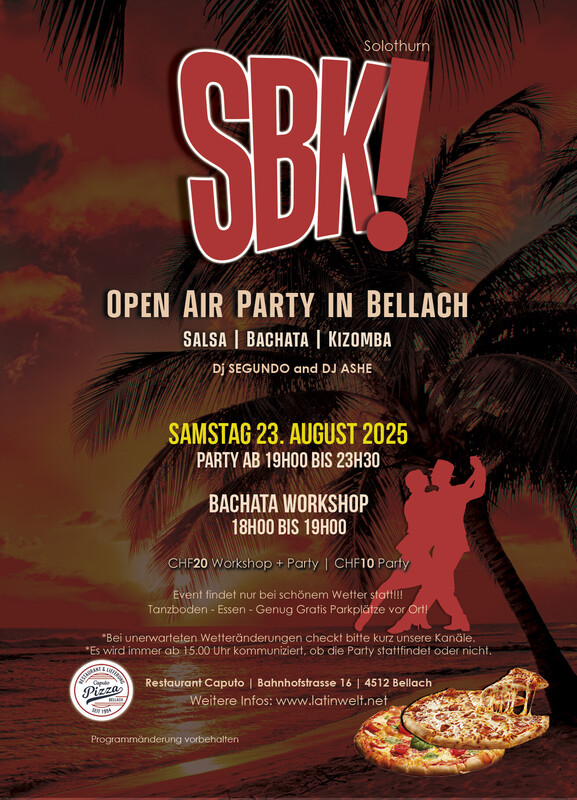 ⚠️ Der Event findet nur bei schönem Wetter statt. 👈🏽 Latinwelt präsentieren: ★SALSA, BACHATA, KIZOMBA OPEN AIR PARTY IN BELLACH Tanzfläche! Dj Segundo & Dj Ashe ★Zeit: 18:00 - 23.30 Uhr Party ★Preis: CHF 10.- Eintritt Party CHF 20.- WORKSHOP + PARTY CHF 15.- Nur Workshop ★Informationen: - Tanzboden - Essen: Pizza 🍕 - Der Event findet nur bei schönem Wetter statt. - 15 Minuten zu Fuss vom bahnhof Bellach - 5 Minuten mit dem Auto von Solothurn - genug Parkplätze vor Ort weitere Informationen unter www.latinwelt.net Anmeldung nicht zwingend.
