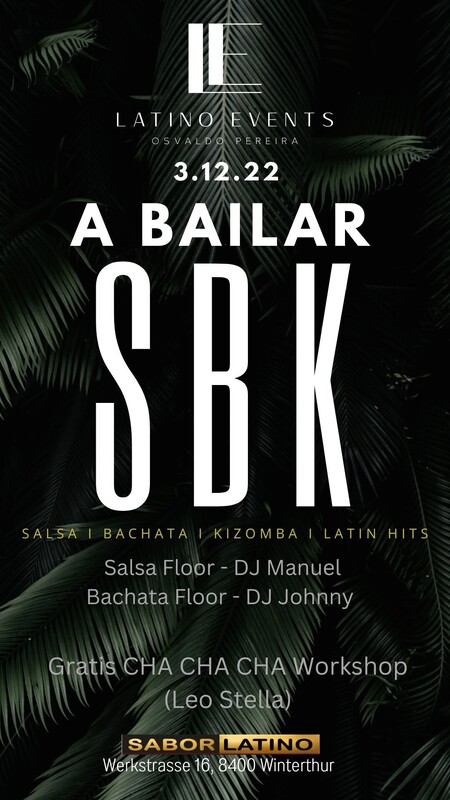 SBK-Party im Sabor Latino Tanzt, feiert und geniesst einen leidenschaftlichen Abend voller Lebensfreude an der ersten SBK Party im Sabor Latino in Winterthur! Liebhaber der Latino-Szene finden in der tollen Atmosphäre dieser Location Freude und Spass unter Tanzbegeisterten. Lasst euch in die feurige Welt der Salsa, Bachata und Kizomba, mit zwei der Top DJ’s, DJ Yasser und DJ Ñoño, entführen und mit leckeren Cocktails verwöhnen. Kommt vorbei und verbringt einen wundervollen Abend mit uns! Salsafloor: DJ Manuel // Sensualfloor: DJ Johnny mit Bachata & Kizomba Vor der Party 20:00 Uhr: Chachacha Workshop mit Leo Stella Wir freuen uns auf euch! Euer SBK-Team saborlatino.ch
