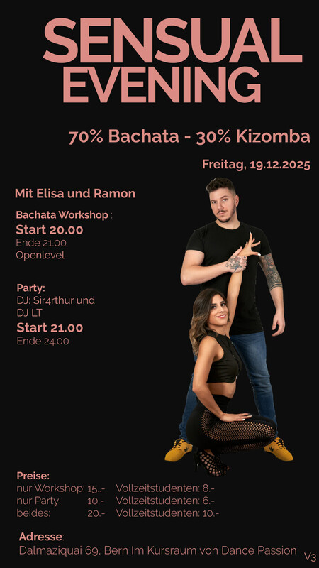 Bachata Workshop mit Elisa und Ramon Start 20.00 Ende 21.00 Openlevel Party: Start 21.00 Ende 24.00 Preise: nur Workshop: 15..- Vollzeitstudenten: 8.- nur Party: 10.- Vollzeitstudenten: 6.- beides: 20.- Vollzeitstudenten: 10.- www.bachata-bern.ch