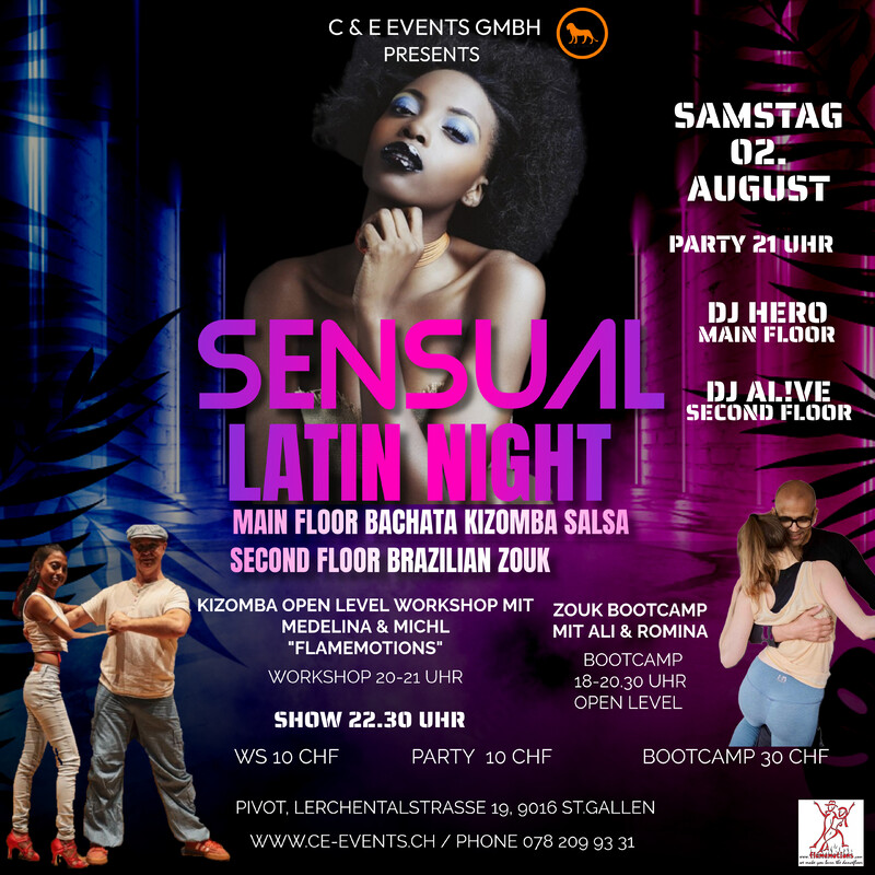 Lasst uns abtanzen und das Leben feiern am Samstag den 2.August im Pivot in St.Gallen!! Party mit 2 Floor ab 21.00 Uhr Main Floor: DJ Hero Bachata Kizomba Salsa Sensual!! Second Floor: DJ Al!ve Brazilian Zouk Workshop mit dem Schweizermeisterpaar 2025 Kizomba Open Level mit Medelina & Michl "Flamemotions" von 20.00 – 21.00 Uhr Bootcamp Open Level Brazilian Zouk mit Ali & Romina von 18 - 20.30 Uhr Bootcamp 30 CHF mit Ali & Romina Workshop 10 CHF Party: 10 CHF Eintritt Tickets bei eventfrog.ch https://eventfrog.ch/de/p/party/latin-brasil/sensual-latin-night-mit-2-floor-7347596378128812314.html Mit einer Showeinlage um 22.30 Uhr mit Medelina & Michl Workshop Anmeldung und Infos: Phone 078 209 93 31 oder per Mail an info@ce-events.ch Wir freuen uns auf einen schönen Abend!! www.ce-events.ch