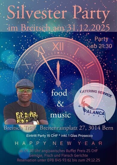 SILVESTER PARTY im BREITSCH TRÄFF mit DJ ALEX Lust das Jahr 2025 mit einem gutem angolanischen Essen und Tanzen ausklingen zu lassen? Dann bist Du hier genau richtig. Komm am 31.12.2025 in den Breitsch Träff und feiere mit uns ins neue Jahr. DJ Alex lässt uns zu seiner Musik tanzen und spielt Salsa, Kizomba, Semba und Afromusik. Angolanisches Essen gibt es frisch zubereitet ab 19:30 Uhr (Buffet mit Gemüse, Fisch und Fleisch) gerne nehmen wir die Reservation bis 29.12.25 entgegen, aber auch spontane Gäste sind Willkommen Preis: 25 Franken pro Person Partybeginn: 21:30 Uhr Eintritt: 15 Franken (inklisive 1 welcome new year Prosecco) location: Breitsch Träff, Breitenrainplatz 27, 3014 Bern phone: 078 845 93 61