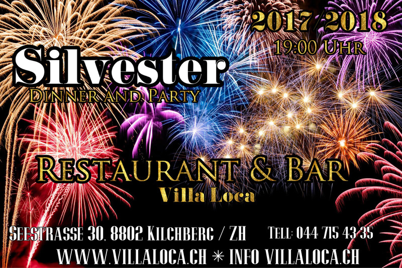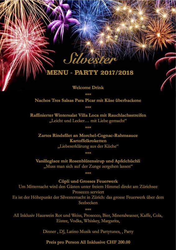 Silvester Dinner & Party SILVESTER ZAUBER AM ZÜRICHSEE 31.12.2017/2018 ☆ ☆ ☆ SILVESTER DINNER & PARTY 2017 / 2018 ☆ ☆ ☆ Mit dieser Feier neigt sich das Jahr 2017 dem Ende und wie schon in den letzten Jahren werden wir es ordentlich krachen lassen. Seien Sie mit dabei und mit unserem Facebook-Event immer auf dem Laufenden. Silvester Dinner & Party SILVESTER ZAUBER AM ZÜRICHSEE 31.12.20172018 http://villaloca.ch/silvesteramzurichsee/ Traumaussicht mit grossem Feuerwerk direkt am See. Bestaunen Sie das bombastische Feuerwerk der Schweiz, den erleuchteten Neujahrshimmel über dem Villa Loca. Starten Sie den Abend mit einem Aperitif. Im Anschluss serviert Ihnen das Team ein exklusives Galamenü in unserem Restaurant Villa Loca. Galamenü Dinner Menu Villa Loca http://villaloca.ch/wp-content/uploads/2017/08/SILVESTER-MENU-20172018-1.pdf SILVESTER – MENU – PARTY Welcome Drink *** Nachos Tres Salsas Para Picar mit Käse überbacken *** Raffinierter Wintersalat Villa Loca mit Rauchlachsstreifen „Leicht und Lecker… mit Liebe gemacht“ *** Zartes Rindsfilet an Morchel-Cognac-Rahmsauce Kartoffelkroketten „Liebeserklärung aus der Küche“ *** Vanilleglace mit Rosenblütensirup und Apfelchüchli „Muss man sich auf der Zunge zergehen lassen“ *** Cüpli und Grosses Feuerwerk Um Mitternacht wird den Gästen unter freiem Himmel direkt am Zürichsee ein Cüpli Prosecco offeriert Es ist der Höhepunkt der Silvesternacht in Zürich: das grosse Feuerwerk über dem Seebecken *** All Inklusiv Hauswein Rot und Weiss, Prosecco, Bier, Mineralwasser, Kaffe, Cola, Eistee, Vodka, und Whiskey DJ, Latino Musik, Partytunes, Party Hits, Disco Preis pro Person All Inklusive CHF 200.00 Let’s Party! Schrieben Sie uns - wir freuen uns auf Ihre Post! Restaurant – Bar – Club Villa Loca Seestrasse 30, 8802 Kilchberg – Zürich www.villaloca.ch info@villaloca.ch Tel: 044 715 43 35