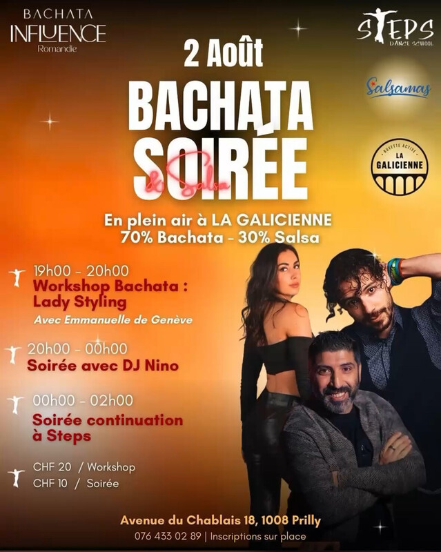 ⭐️Soirée Bachata, venez danser sous les étoiles avec DJ Nino ⭐️En plein air à la Galicienne 70% bachata et 30% salsa 👉19h00 à 20h00: Workshop, lady styling donné par Emmanuella de Genève 20.- pour le cours (inclus l'entrée pour la soirée ) Pas besoin de reserver, inscription sur place ! 👉 20h00 à 00h00 : DJ Nino aux platines 👉 00h00 à 02h00: Soirée continuation à Steps ✅ Entrée pour la soirée : 10.- (5.- pour étudiant·e·s / AVS / AI) ✅ Parking gratuit collé à la Galicienne😉