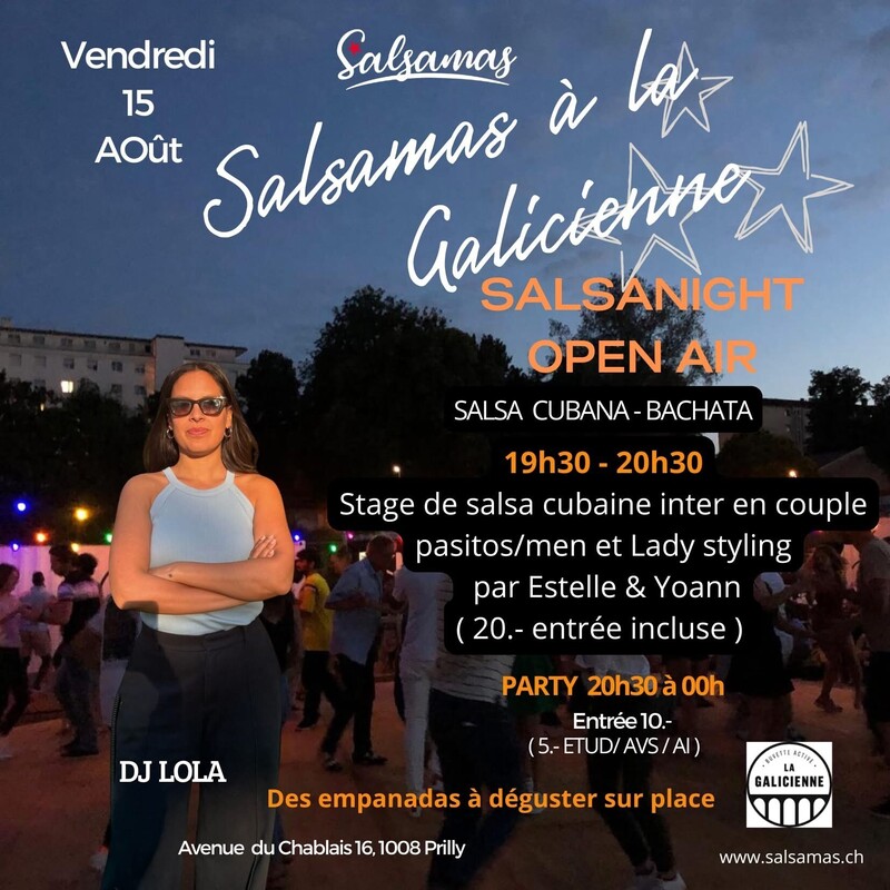 Soirée Salsa Cubana & Bachata sous les étoiles avec Salsamas 2025 à La Galicienne ! Quel plaisir de vous retrouver sur la piste, sous les étoiles ! 💫Rendez-vous les vendredis, à La Galicienne pour une ambiance caliente ! 💫19h30 à 20h30 : Stage de salsa cubaine inter en couple/pasitos, men & lady styling donné par Estelle et Yoann 20.- pour le cours (inclus l'entrée) 💫20h30 à 00h00 : DJ Lola & DJ Fouzi aux platines (et d'autres DJs à venir) Salsa & Bachata au rendez-vous ! ✔️Entrée : 10.- (5.- pour étudiant•e•s / AVS / Al) 💫Dégustation sur place des empanadas et salade, Causa ✔️Parking gratuit collé à la Galicienne Plus d'infos : www.salsamas.ch