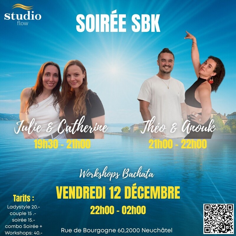 🎊 LA MENSUELLE SBK ➡️ Vendredi 12 décembre •19h30 - 21h00 Bachata Lady Styling •21h00 - 22h00 Bachata Workshop: Open level •22h00 - 02h Soirée SBK avec Dj Colada ❤️🔥 🟣 Bachata Ladystyling Développez votre style en bachata 🌸 Julie & Catherine seront là pour vous apprendre des mouvements simples et élégants à intégrer en soirée. Les filles profitez-en ! 💃🏽 🟣 Bachata Couple: open level Venez travailler votre flow et connexion au partenaire et à la musique 🎶 avec Théo et Anouck Pour les follows: comment suivre un mouvement et quelles possibilités d’interprétation tout en apprenant à le faire avec stabilité et élégance. Pour les leaders: apprentissage d’une passe tout en apprenant comment la guider avec le corps de manière douce et “respirée”. Workshops qui se poursuivent sur une soirée SBK animée par Séb @Dj Colada 🤗 📍 Rue de Bourgogne 60, 2000 Neuchâtel ☑️ Pas d’inscription nécessaire ☑️ Tarif spécial pour Workshops + soirée ☑️ Bar à cocktails ouvert dès 22h00 Si tu as des questions écris-nous en mp, toute l’équipe du Studio Flow est à ta disposition 🤗