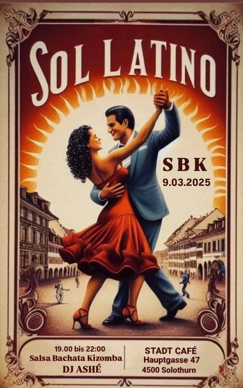 Wir laden Sie ein, zu tanzen und gemeinsam einen schönen Latinoabend zu genießen. Wir werden zu bekannten Rhythmen tanzen. Salsa . Bachata . Kizomba . Dj Ashé . STADT CAFE Hauptgasse 47,4500 Solothurn Die schönste Barockstadt der Schweiz