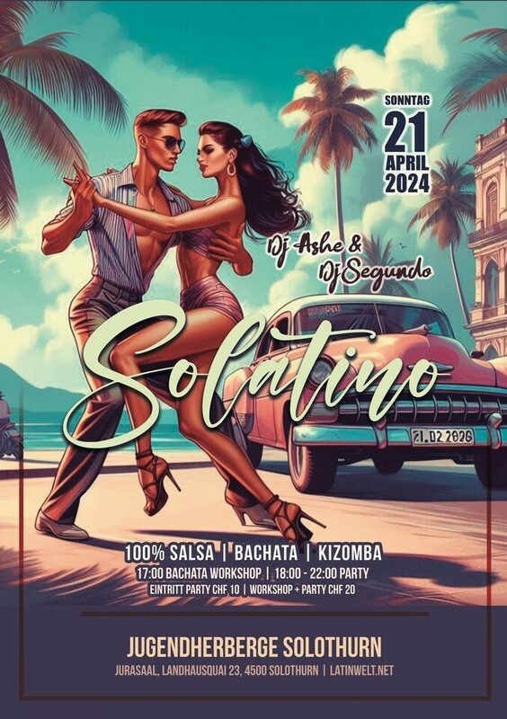 SOLATINO!!! ☀️🥳🍹🔥 Dj Ashe & Dj Segundo Bachata Workshop + Party! ------------------------------------------- ★★★ PARTY ★★★ ------------------------------------------- 100% Salsa, Bachata & Kizomba Party ab 18:00 Uhr bis 22:00 Uhr ---------------------------- ★★★ WORKSHOP ★★★ ---------------------------- 17:00 - 17:50 Uhr - Salsa Workshop (Open Level) Workshop setzt Vorkenntnisse voraus. ---------------------- ★★★ PREISE ★★★ ---------------------- AK.: CHF 10 Party | CHF 20 Workshop + Party ----------------------- ★★★ ADRESSE ★★★ ----------------------- Jugendherberge, Jurasaal Landhausquai 23, 4500 Solothurn 1. Stock ★ Weitere Informationen: - Programmänderung vorbehalten - Parkett Tanzboden - 5 Minuten zu Fuss vom Hauptbahnhof Solothurn - Verschiedene Parkmöglichkeiten in der Nähe Wir freuen uns auf Euren Besuch und auf einen unvergesslichen Tanzabend