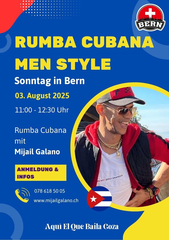 A Rumbear Rumberos Sonntag in Bern Workshop Rumba Cubana mit Mijail Galano 11:00 - 12:30 Rumba Cubana Men Style Info & Anmeldung 078 618 50 05 Aquí El Que Baila Goza www.mijailgalano.ch