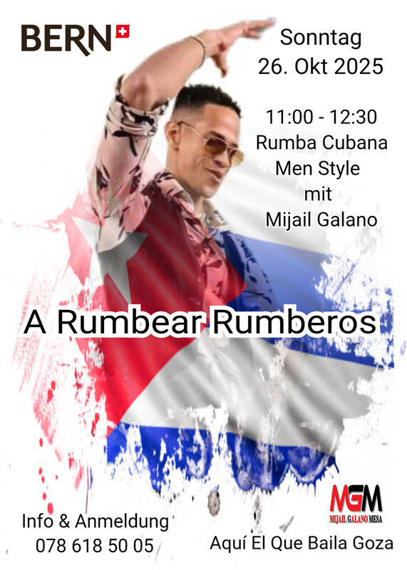 Sonntag in Bern A Rumbear Rumberos mit Mijail Galano 11:00 - 12:30 Rumba Cubana Men Style Info & Anmeldung 078 618 50 05 Aquí El Que Baila Goza www.mijailgalano.ch