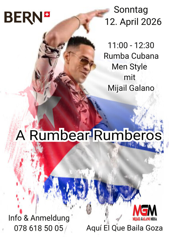 A Rumbear Rumberos Rumba Cubana in Bern mit Mijail Galano 11:00 - 12:30 Rumba Cubana Men Style Info & Anmeldung 078 618 50 05 Aquí El Que Baila Goza www.mijailgalano.ch