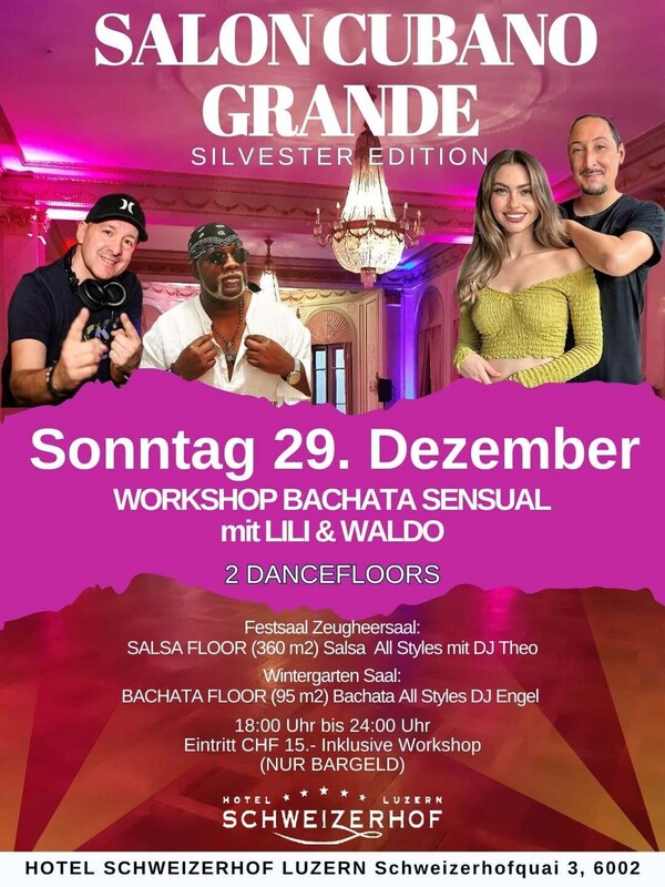 Sonntag 29. Dezember (18h.-24h.) SALON CUBANO GRANDE Silvester Edition Herzlich Willkommen im Legendäre "SALON CUBANO " des 5-Sterne-Hotels Schweizerhof Luzern. Salsa & Bachata auf 2 Tanz-Parquett Dance Floors TÜRÖFFNUNG 18.00 UHR 18:30 Uhr bis 19:30 Uhr WORKSHOP BACHATA SENSUAL MIT LILI & WALDO SALSA FLOOR (360 m2): Salsa All Styles mit DJ Theo BACHATA FLOOR (95 m2): Bachata All Styles DJ Engel 18:00 Uhr bis 24:00 Uhr Eintritt CHF 15.- Inklusive Workshop (NUR BARGELD) --------------------------------------------------------- ZEUGHEERSAAL: Salsa Floor mit DJ Theo Der prächtige Festsaal ist unser Juwel. Der im Jahr 1865 erbaute Ballsaal ist ideal für Grossanlässe mit bis zu 500 Personen und 360 m2 Tanz-Parkett. WINTERGARTEN: Bachata Floor mit DJ Engel Mit seinem kunstvollen Glasgemälde an der Decke ist besonders beliebt für Kleinanlässe mit bis 95 m2 Tanz-Parquett. ------------------------------------------------------------------ DAS 5 STERNE HOTEL SCHWEIZERHOF LUZERN liegt direkt am Vierwaldstättersee und in unmittelbarer Nähe zum Stadtzentrum von Luzern. ------------------------------------------------------------------ HOTEL SCHWEIZERHOF LUZERN Schweizerhofquai 3, 6002 Luzern www.schweizerhof-luzern.ch Viele Parkplätze Möglichkeiten in der Nähe: www.parking-luzern.ch https://fb.me/e/7hixwxXjR