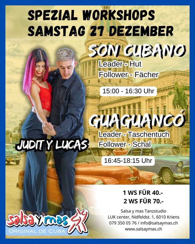 Feiertags - Special: Wir freuen uns sehr, einen tollen Workshop-Tag mit Judit Moreno und Lucas Beluzo anbieten zu können! SAMSTAG, 27. Dezember 2025 15:00 – 16:30 Uhr: SON CUBANO Leader mit Sobrero Follower mit Fächer Salsakenntnisse erforderlich 1 mal 90 min. für CHF 40.- 16:45 – 18:15 Uhr: GUAGUANCO Leader mit Taschentuch Follower mit Schal kein Tanzpartner nötig 1 mal 90 min. für CHF 40.- Lust auf ein Doppelpack? Wer beide WS besucht, profitiert und bezahlt total nur CHF 70.- Kurslokal: Salsa y mas Tanzstudio, LUK Center, Nidfeldstrasse 1, 6010 Kriens (an der Stadtgrenze Luzern) Anmeldung: Anmeldung bitte rasch unter info@salsaymas.ch, Teilnehmerzahl ist beschränkt. Die Anmeldung ist verbindlich! Siehe auch www.salsaymas.ch für alle weiteren Kurse und Infos. Tanzschule Salsa y mas, Urbano Rodríguez Dubé Salsa y mas Tanzstudio LUK Center, Nidfeldstrasse 1 6010 Kriens (Luzern) Tel: 079 350 05 76 / 078 861 54 11 info@salsaymas.ch www.salsaymas.ch Jedes Jahr Tanzreisen nach Kuba! „…para que conozcas a Cuba!“ www.salsaymas.ch