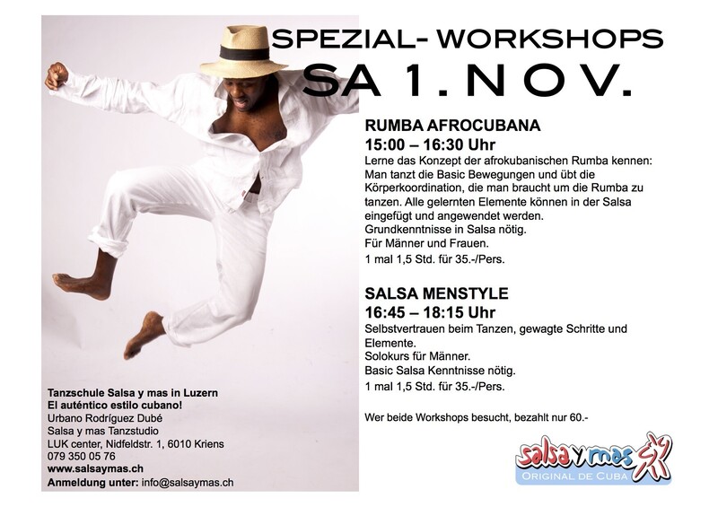 Wir freuen uns sehr, einen tollen Workshop-Tag mit Urbano Rodriguez Dubé anbieten zu können! Lasst euch ihm in die reiche Welt des kubanischen Tanzes entführen und begleiten. Wir freuen uns darauf! SAMSTAG, 1. November 2025 15:00 – 16:30 Uhr: RUMBA AFROCUBANA Lerne das Konzept der afrokubanischen Rumba kennen: Man tanzt die Basic Bewegungen und übt die Körperkoordination, die man braucht um die Rumba zu tanzen. Alle gelernten Elemente können in der Salsa eingefügt und angewendet werden. Grundkenntnisse in Salsa nötig. Für Männer und Frauen. 1 mal 90 min. für CHF 35.- 16:45 – 18:15 Uhr: SALSA MENSTYLE Selbstvertrauen beim Tanzen, gewagte Schritte und Elemente. Basic Salsa Kenntnisse nötig. Solotanz für Männer 1 mal 90 min. für CHF 35.- Lust auf ein Doppelpack? Wer beide WS besucht, profitiert und bezahlt total nur CHF 60.- Kurslokal: Salsa y mas Tanzstudio, LUK Center, Nidfeldstrasse 1, 6010 Kriens (an der Stadtgrenze Luzern) Anmeldung: Anmeldung bitte rasch unter info@salsaymas.ch, Teilnehmerzahl ist beschränkt. Die Anmeldung ist verbindlich! Siehe auch www.salsaymas.ch für alle weiteren Kurse und Infos. Tanzschule Salsa y mas, Urbano Rodríguez Dubé Salsa y mas Tanzstudio LUK Center, Nidfeldstrasse 1 6010 Kriens (Luzern) Tel: 079 350 05 76 / 078 861 54 11 info@salsaymas.ch www.salsaymas.ch Jedes Jahr Tanzreisen nach Kuba! „…para que conozcas a Cuba!“ www.salsaymas.ch