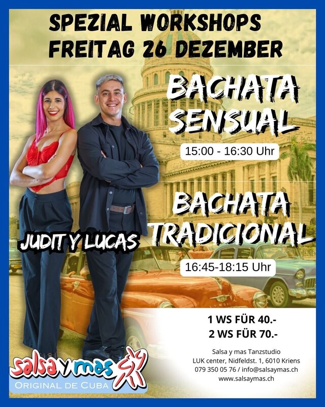 Wir freuen uns sehr, einen tollen Workshop-Tag mit Judit Moreno und Lucas Beluzo anbieten zu können! FREITAG, 26. Dezember 2025 15:00 – 16:30 Uhr: BACHATA SENSUAL 1 mal 90 min. für CHF 40.- 16:45 – 18:15 Uhr: BACHATA TRADITIONAL 1 mal 90 min. für CHF 40.- Lust auf ein Doppelpack? Wer beide WS besucht, profitiert und bezahlt total nur CHF 70.- Parallel dazu gibt es auch Salsa Cubana Workshops mit Urbano. Kurslokal: Salsa y mas Tanzstudio, LUK Center, Nidfeldstrasse 1, 6010 Kriens (an der Stadtgrenze Luzern) Anmeldung: Anmeldung bitte rasch unter info@salsaymas.ch, Teilnehmerzahl ist beschränkt. Die Anmeldung ist verbindlich! Siehe auch www.salsaymas.ch für alle weiteren Kurse und Infos. Tanzschule Salsa y mas, Urbano Rodríguez Dubé Salsa y mas Tanzstudio LUK Center, Nidfeldstrasse 1 6010 Kriens (Luzern) Tel: 079 350 05 76 / 078 861 54 11 info@salsaymas.ch www.salsaymas.ch Jedes Jahr Tanzreisen nach Kuba! „…para que conozcas a Cuba!“ www.salsaymas.ch